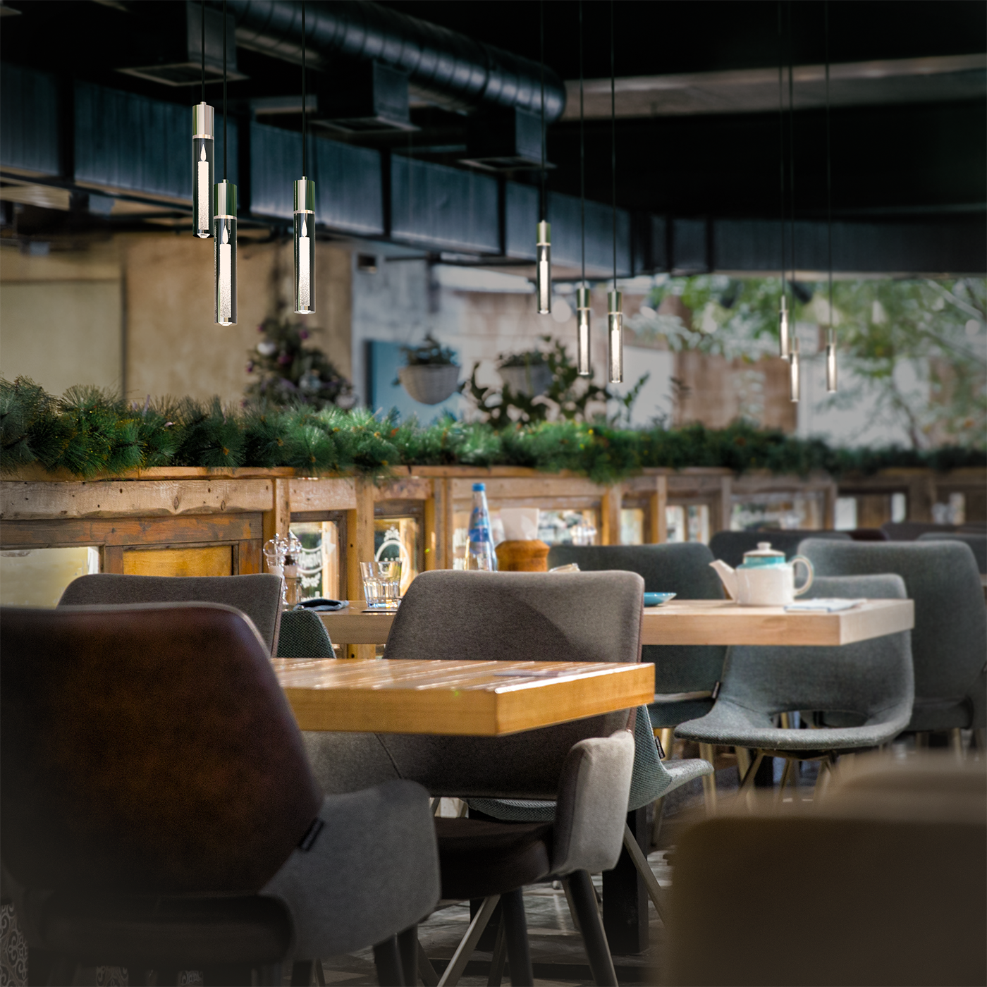 Screw-in, cast acrylic light guide features a laser-etched candle. Fixture hangs 6″ to 96″ inches from ceiling. Dimmable and damp location rated.