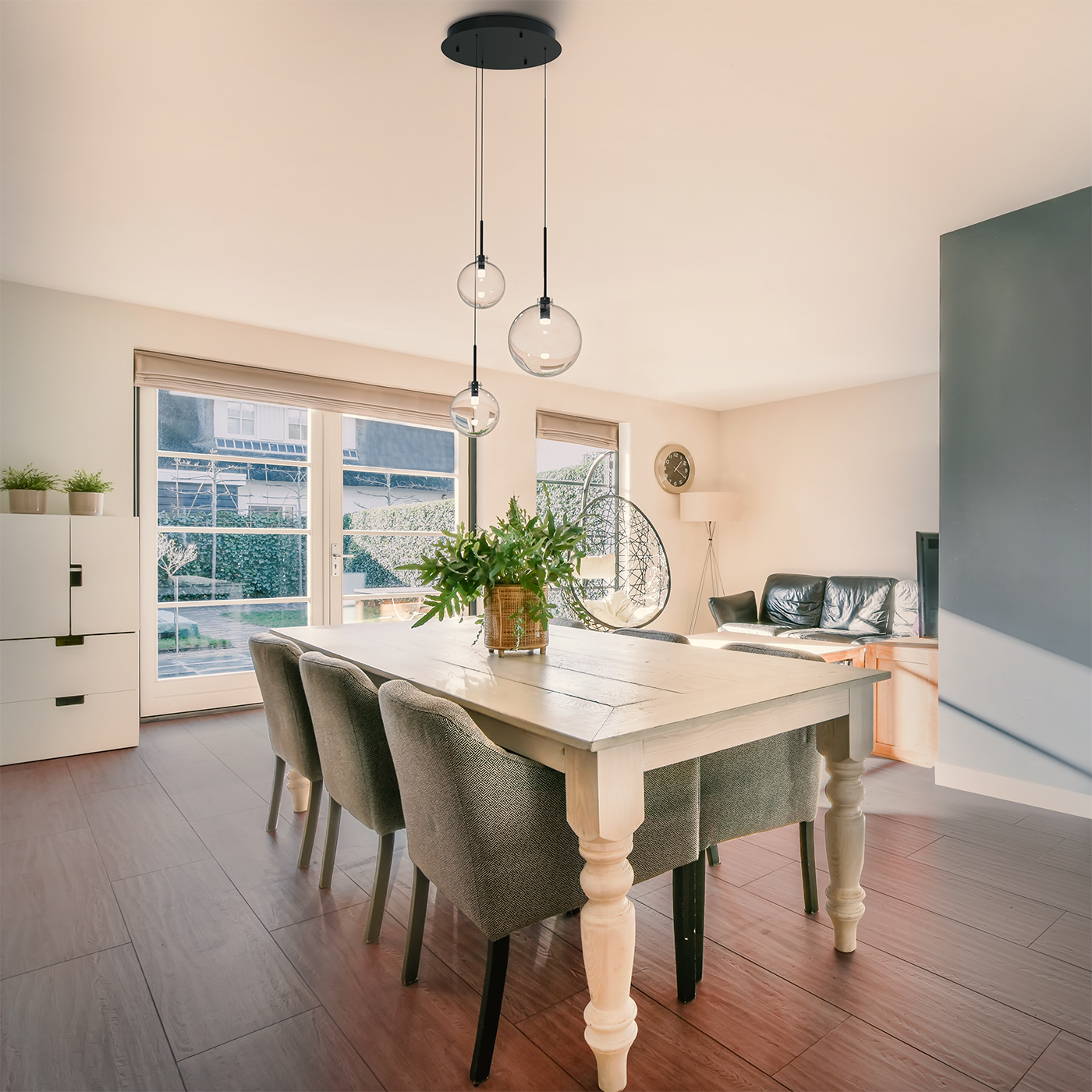 Three clear glass sphere pendants (one 12” and two 8”) appear to be floating in air around glowing cylinders of light. Suspended from a 20” round canopy.