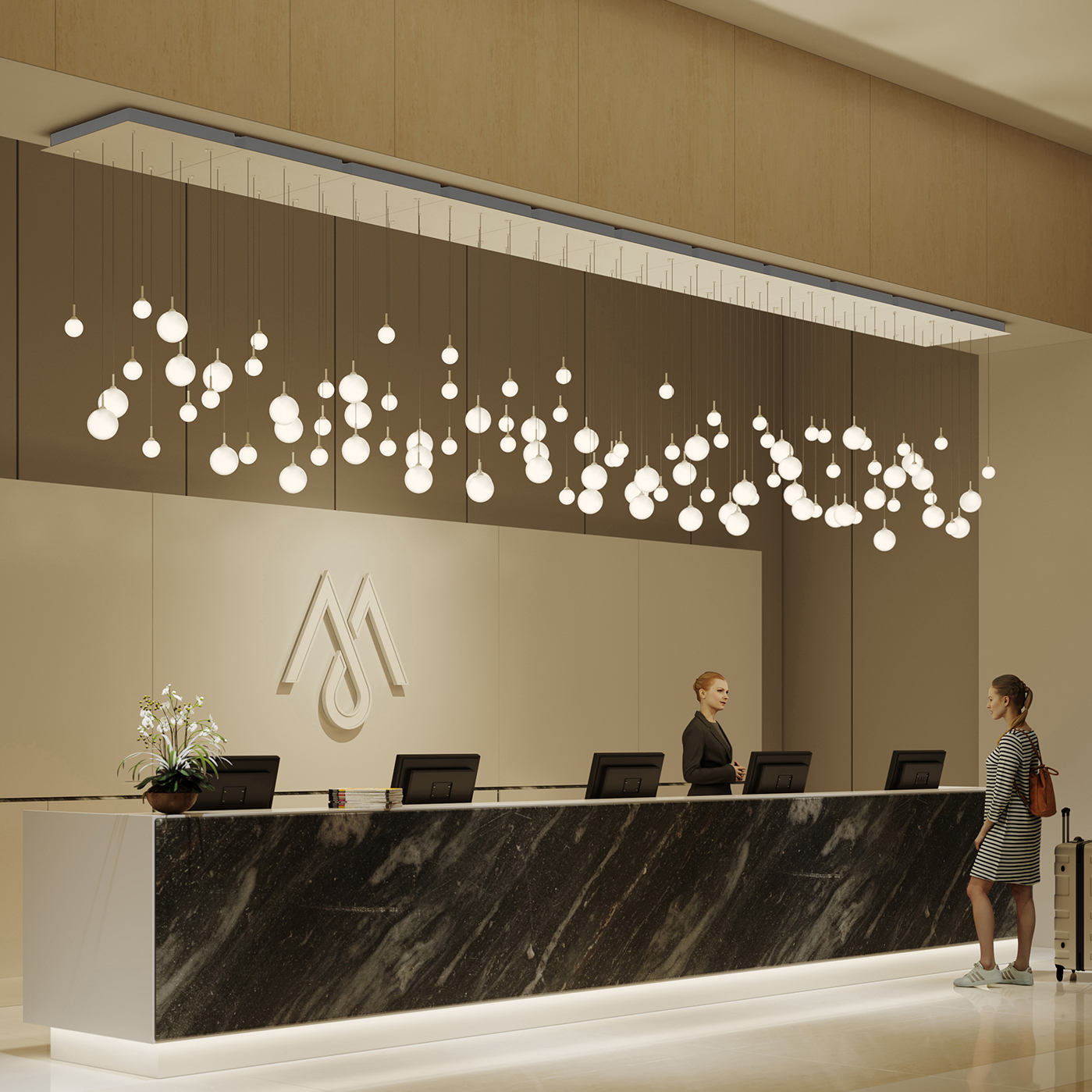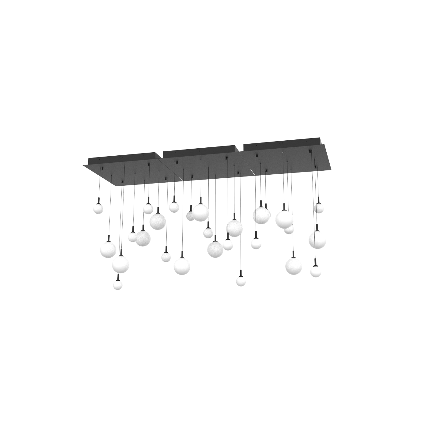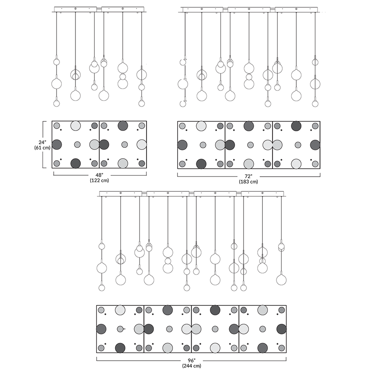 Nine white glass globes of varying size hang suspended from each 24″ canopy, creating an illusion of falling raindrops.