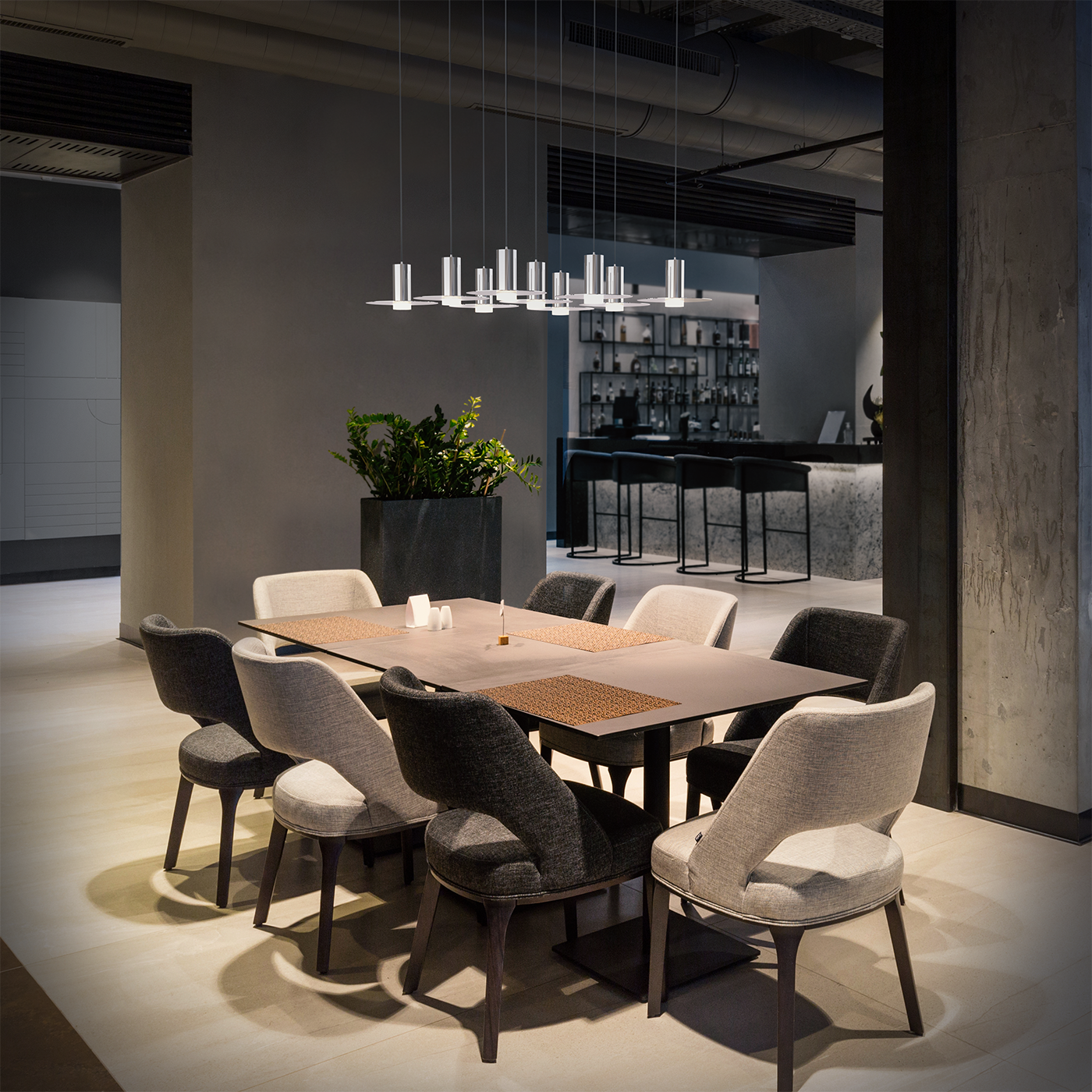 24in Square canopy with 9 Novo Short pendants combined with 6in brims in a level pattern.
