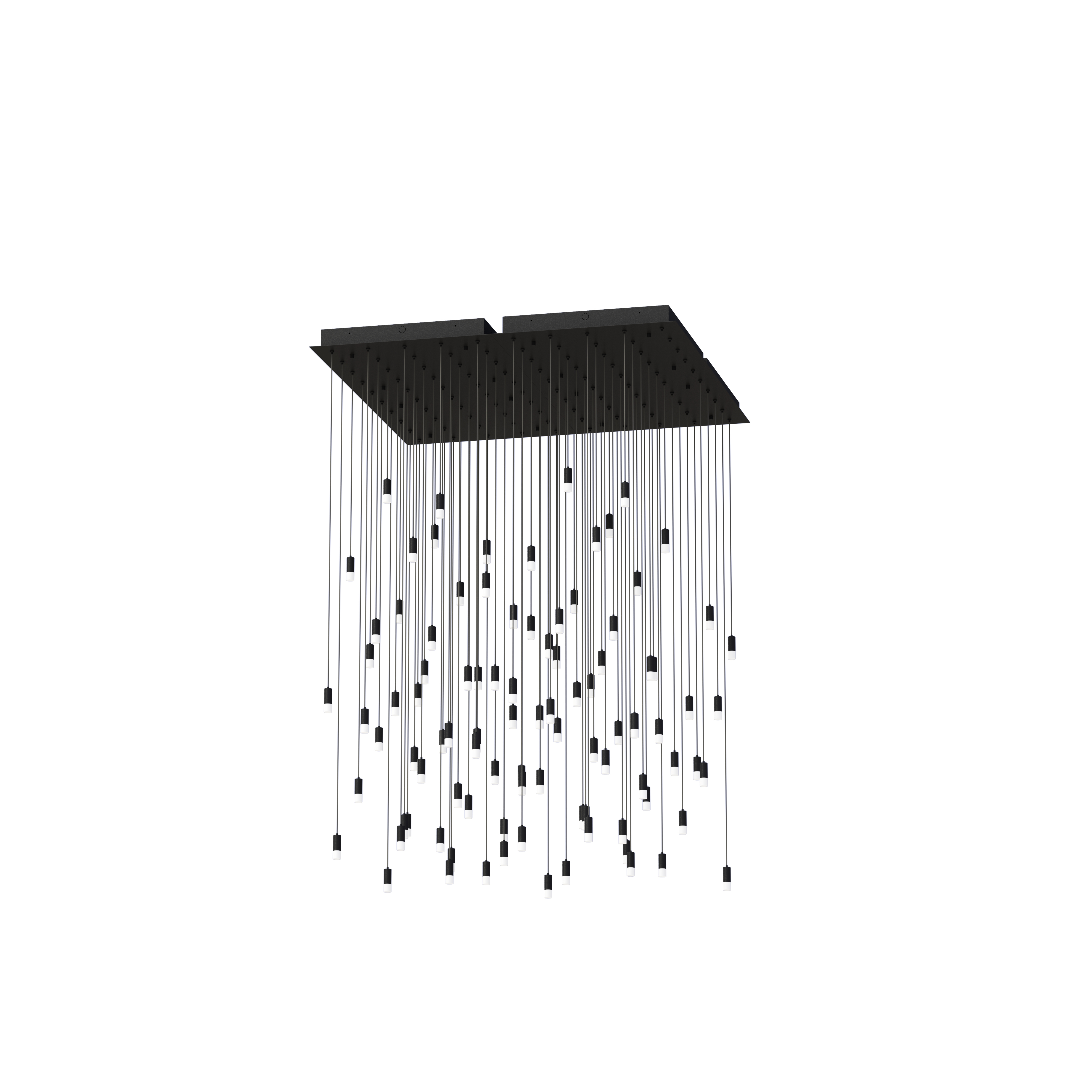 One hundred Short Frosted pendants create a statement of vibrant light. Fixture uses four 24” square canopies with 25 ports each to achieve this stunning design.