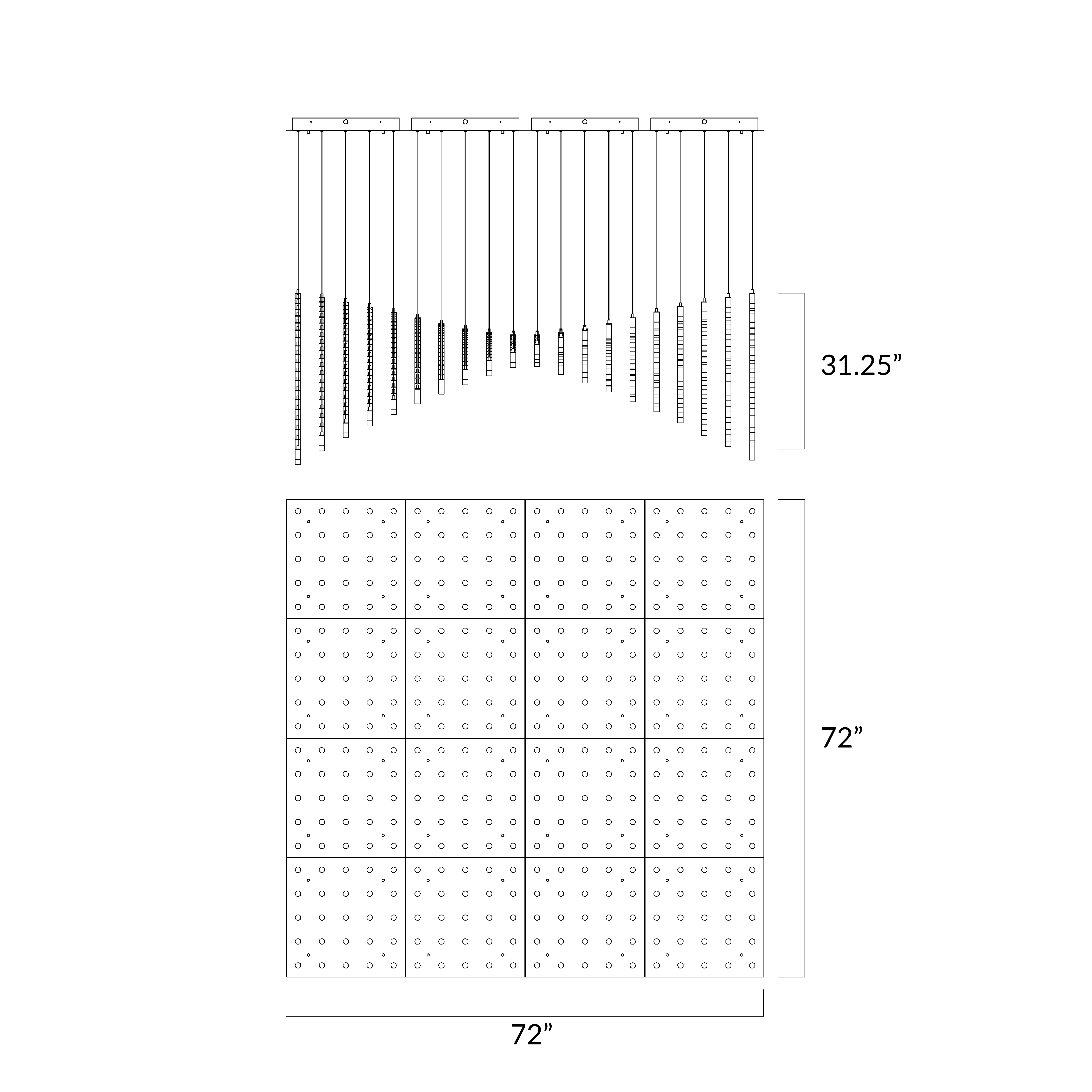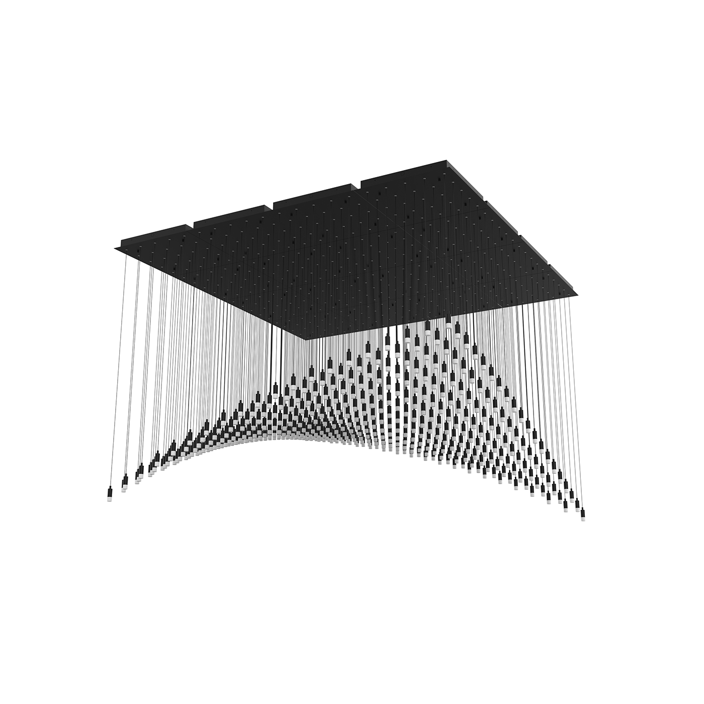 Four hundred Short Frosted pendants are suspended from sixteen 24” square canopies to create a vibrant arching wave design.