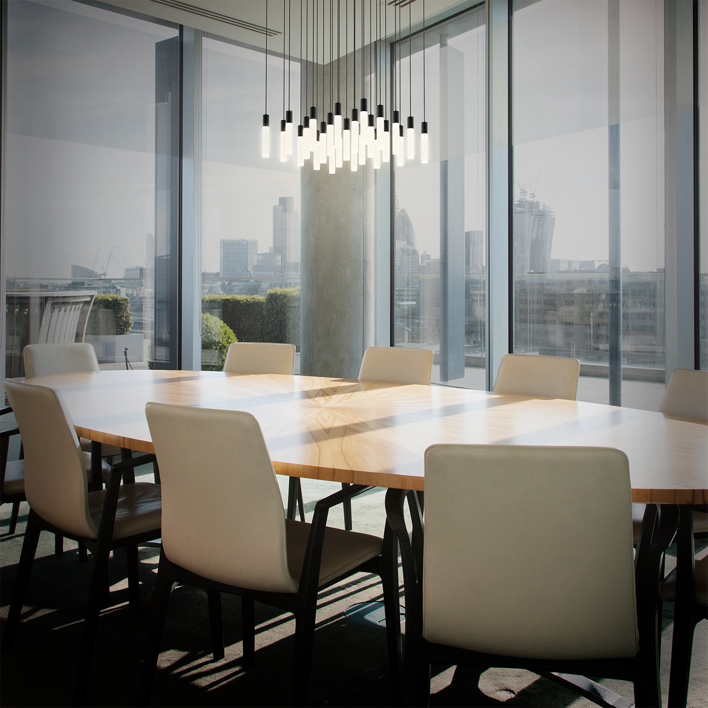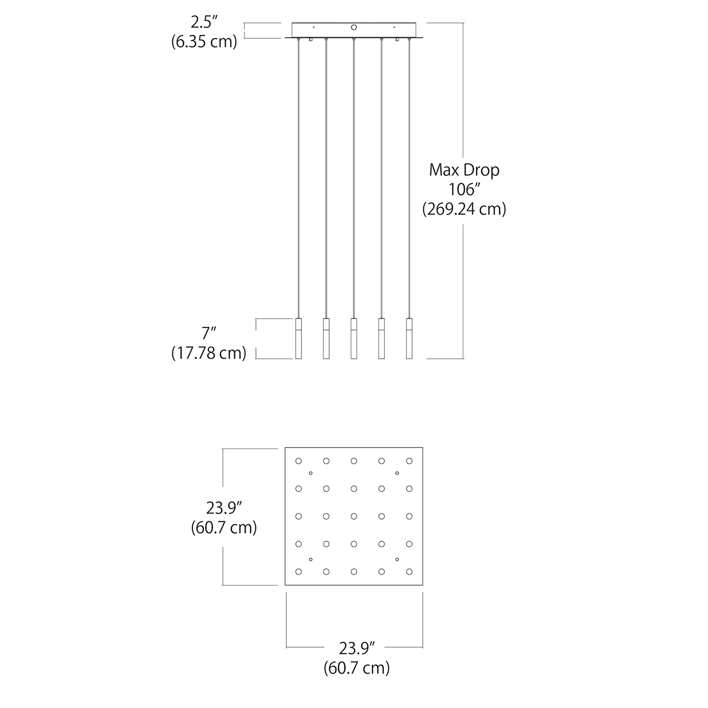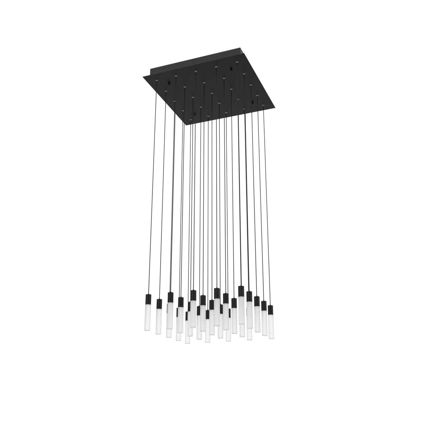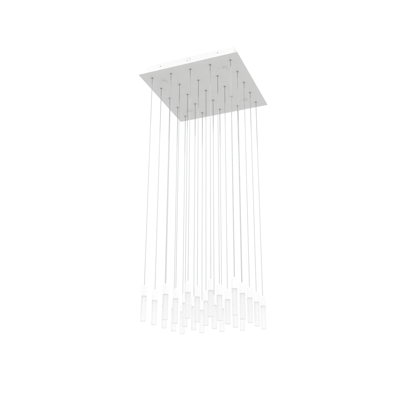 Twenty-five Tall Frosted pendants are suspended from a 24” square canopy.