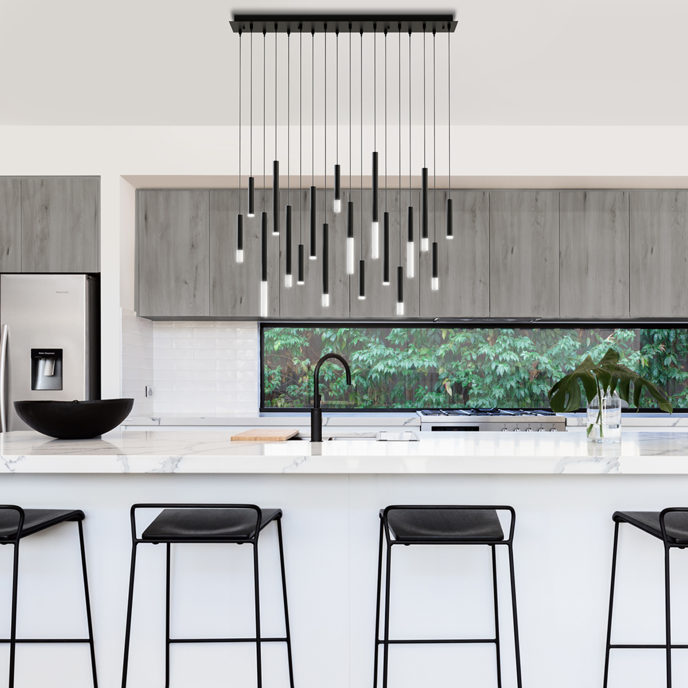A decorative pendant made from cylinders and light guides of differing lengths that create an artistic random pattern. Comes out of the box in a pre-arranged random pattern. Can be re-adjusted any time after installation.