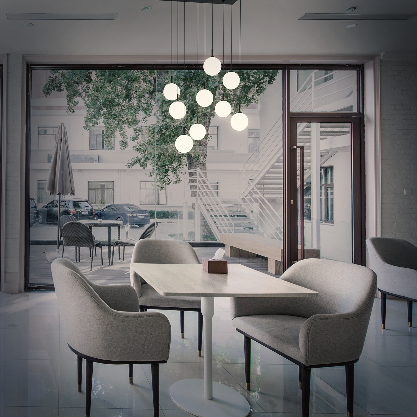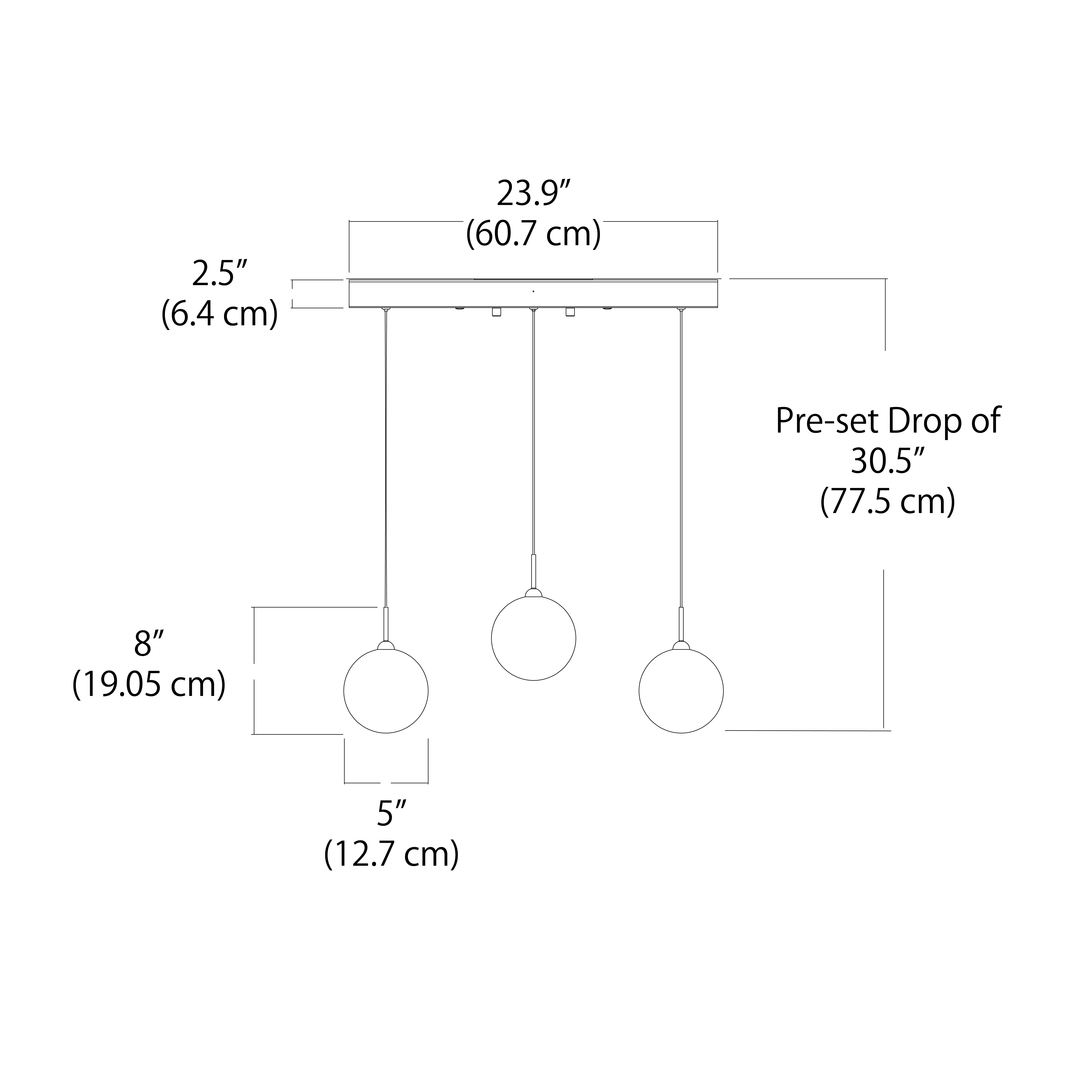 Nine large white glass globe pendants are spaciously suspended from a square 24” canopy.