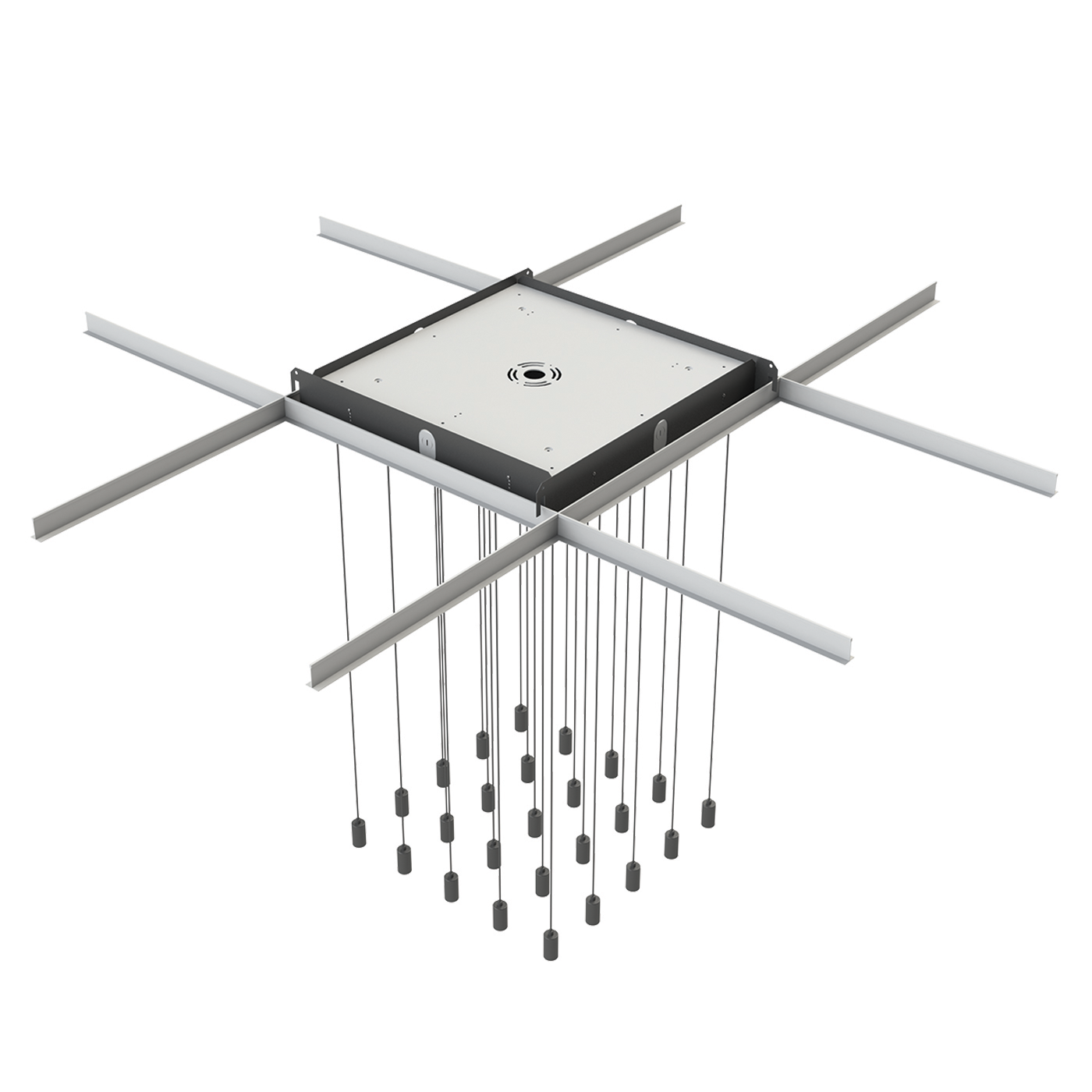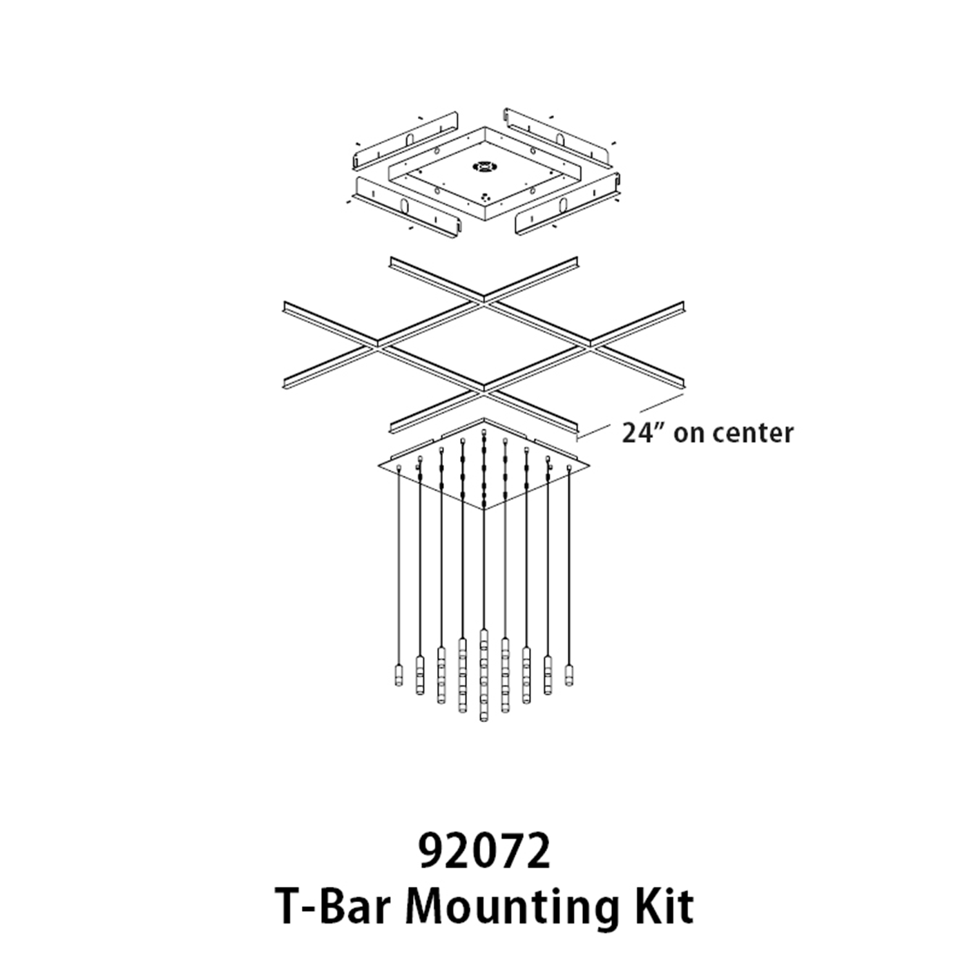 The kit adds support to create a flush mount fixture and sits behind T-Bar supports, unseen from below. Works with our 24″ Multi-Port Canopy, Quatro Modular System, or Steelos Pendants. Adjustable mounting height to accommodate different ceiling tile thicknesses. Each 24″ fixture requires one mounting kit