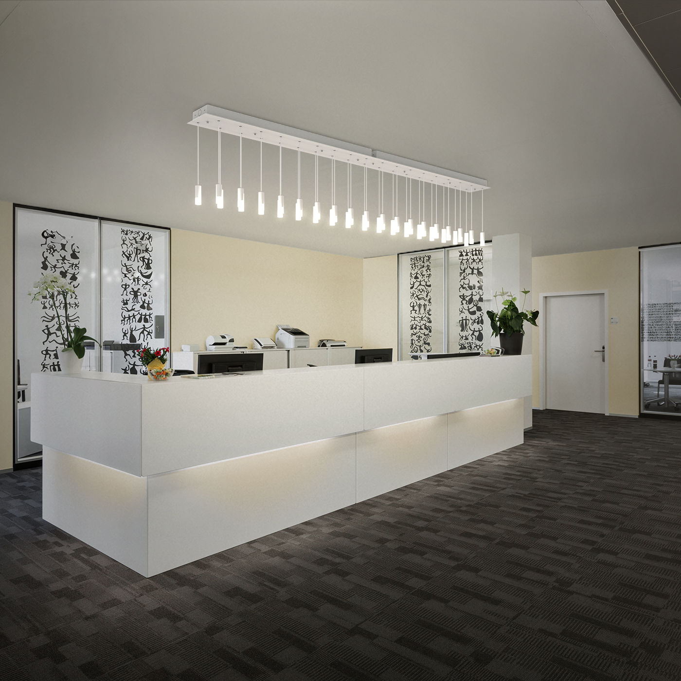 Thirty-six Short Frosted pendants, suspended from a 76” canopy, bring warm light to any room. Level pattern spreads light evenly.